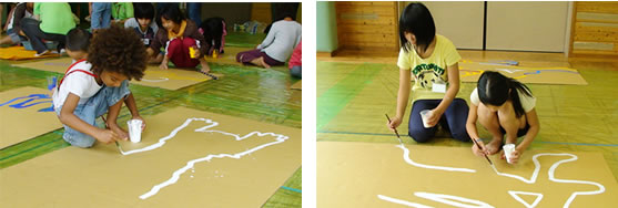「魔法のペン」で描いた人の形を、絵の具でふちどっていく。