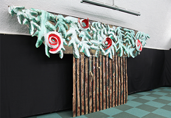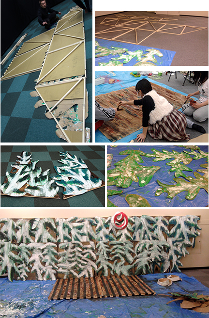 軽くつくるために、細い木材を使って枠組みをつくり、そこにダンボールを貼りました。その上から、ダンボールで作ってポスターカラーで色を塗った葉っぱや幹をはりつけていきます。