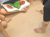 (2)の場所にもう一度座ってみて、テーブルの天板の形を考える。絵本をおいてみるとよい。ちょうど読みやすい天板の形になるようにしるしをつける。