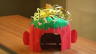 切ったらもう一度頭にかぶせます。ダンボールの重なっている部分は切りにくいので、横にもってきます。目の位置にクレヨンなどでしるしをつけます。