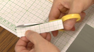 工作用紙を切って横のほねをつくります。たて2センチ、横10センチを切り取ります。